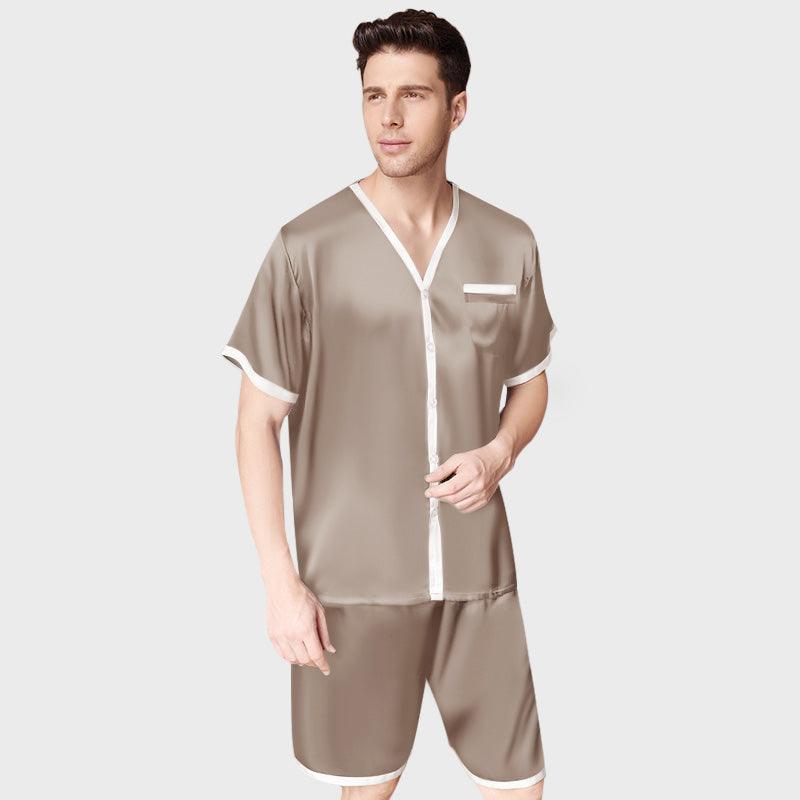• Button-Down und elastischer Bund. Dieses Herren-Pyjama-Set aus Seide mit kurzärmligem Oberteil zum Knöpfen lässt sich leicht an- und ausziehen. Eine Brusttasche sorgt für einen guten Look und die Shorts mit elastischem Bund passen sich Ihren Bedürfnissen an, wann immer Sie sie anpassen.
