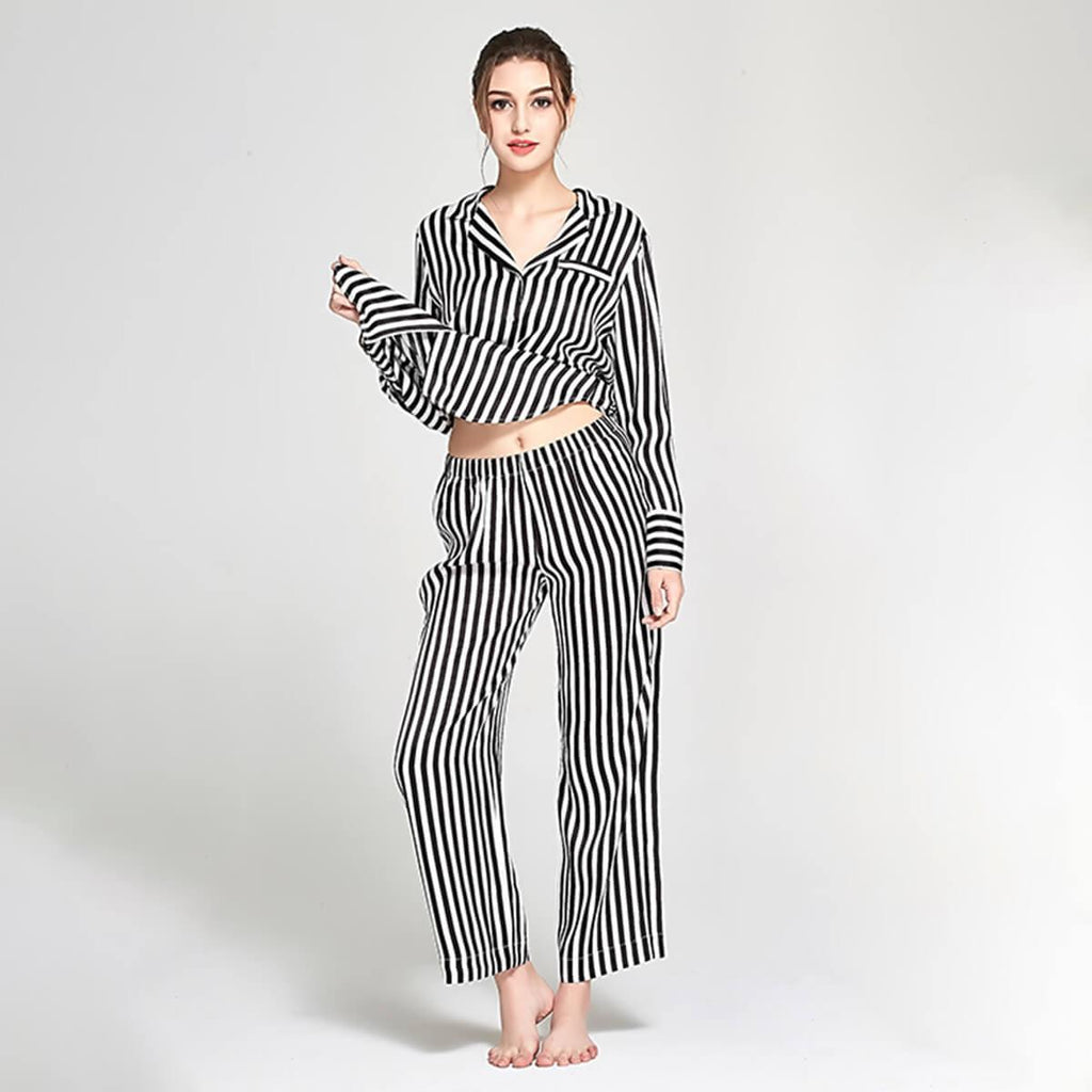 • Features: Women pajamas sets give you the ultimate comfort. Long sleeve; classic Notched-Neck; button-down closure design, easy to get on and off. The pocket in the chest allows you to store some small stuff. Elastic waistband that its tightness is suitable is easy to wear.
